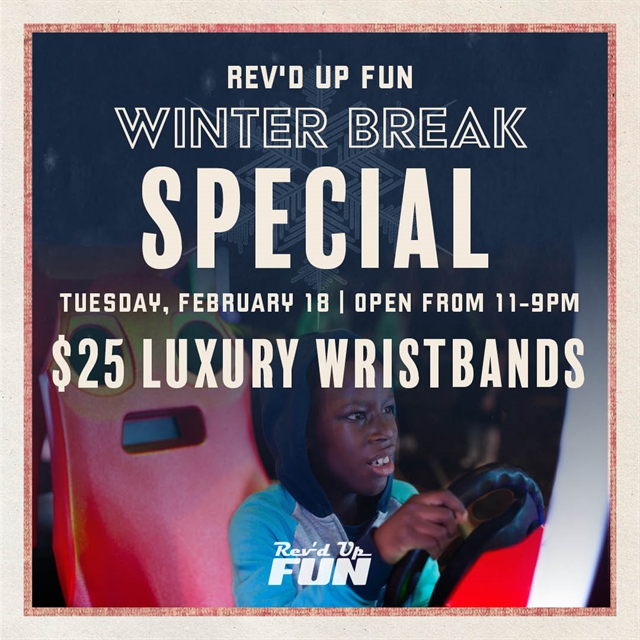 Join us on Tuesday, February 18, for $25 Luxury Wristbands for all day from from 11am-9pm! Luxury Wristbands are valid for unlimited play on Ballocity, Spin Zone Bumper Cars, Laser Tag, XD Dark Ride and our Ropes Course with Zip Line.